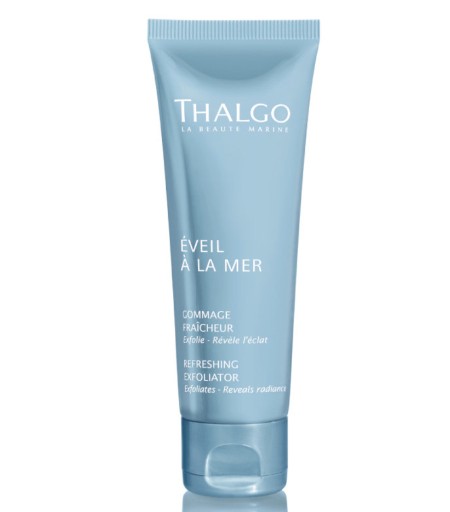 Thalgo eveil a la mer refreshing exfoliator to odświeżający peeling do cery normalnej i mieszanej. żelowa substancja z trzema różnymi typami cząsteczek złuszczających (superdrobna ziemia okrzemkowa, średniej grubości sproszkowana krzemionka, grube łupiny migdałów) fenomenalnie usuwa obumarłe komórki, odsłaniając zdrową, promienną i bardziej jednolitą skórę. obecny w składzie morski kompleks seve bleue nawilża naskórek i zapewnia komfort bez uczucia napięcia czy szczypania.