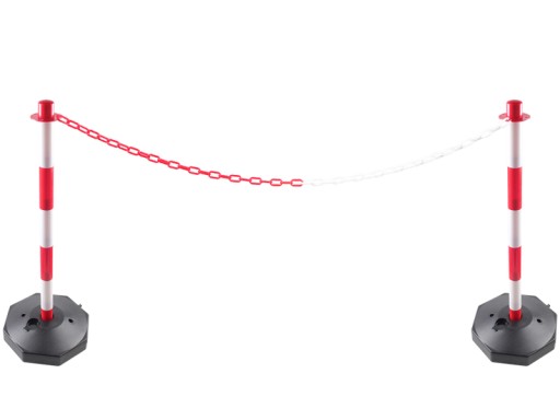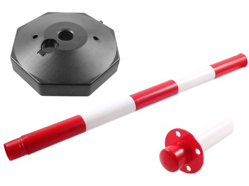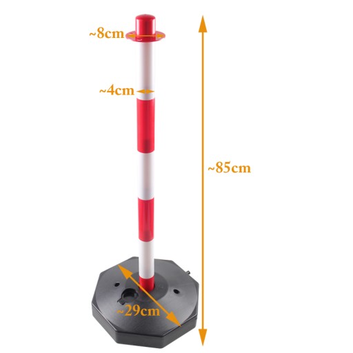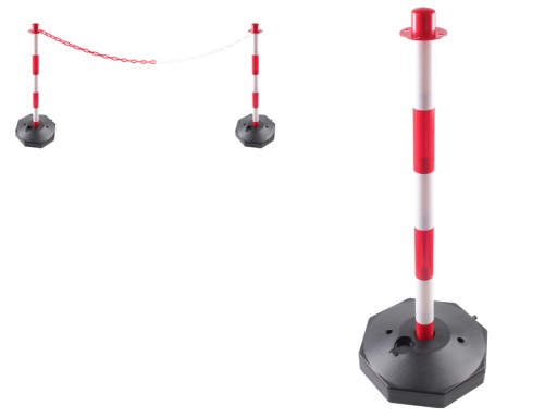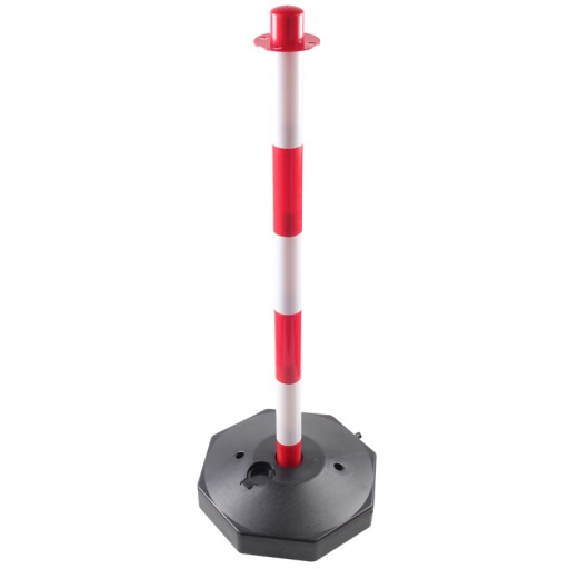 Czerwono-biały słupek wygrodzeniowy o wysokości 85 cm wykonany z wytrzymałego tworzywa. Podstawa zapewnia dużą stabilność dzięki możliwości obciążenia wodą lub pisakiem.