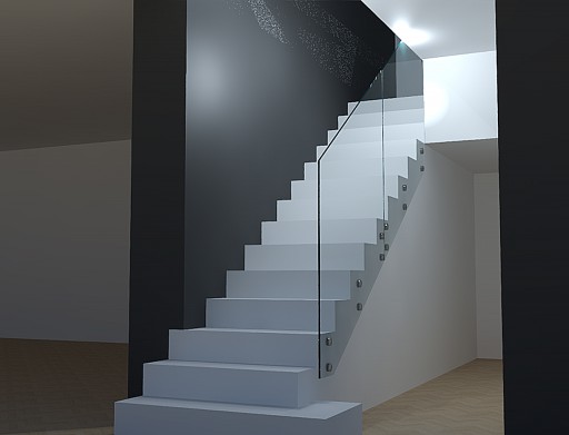 Balustrada szklana na rotulach wykonana jest z hartowanego, klejonego szkła transparentnego ESG / VSG, które jest odporne na uderzenia i bezpieczne w użytkowaniu i zamontowana jest do schodów za pomocą okrągłych Rotul o średnicy 50 mm.