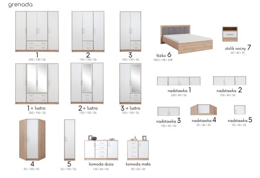 Szafy GRENADA to systemowy sposób na wypełnienie swojej garderoby bądź przedpokoju. Idealnie dobrana kolorystyka bieli oraz dodatku dębu sonoma wprowadzi ład i uporządkowanie do Twojego wnętrza. Duży wybór segmentów oraz możliwości wyboru nadstawek do szaf gwarantuje ogromne powierzchnie magazynowe w Twoim domu i idealne wpasowanie do każdego wnętrza.
