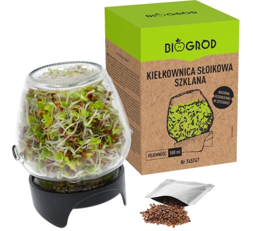 - Prosta w użyciu, z nasionami w zestawie - składa się jedynie z dwóch elementów. W komplecie otrzymujesz torebkę nasion rzodkiewki do uprawy kiełków.