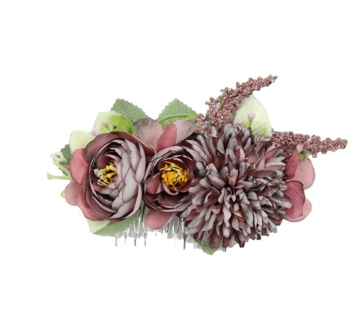 Piękny, romantyczny grzebyk do włosów w stylu boho wykonany z kwiatów kamelii i astrów w tonacji zgaszonego ciemnego różu, zdobiony gałązkami bluszczu i ozdobnych traw.