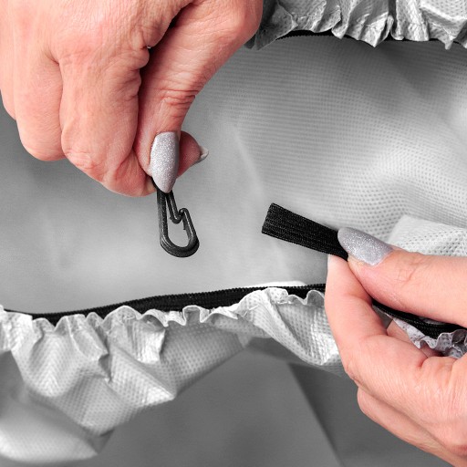 Mocowanie do roweru zapewnia solidny elastyczny ściągacza oraz gumka z haczykiem dzięki czemu pokrowiec plandeka jest łatwy do zakładania i ściągania z roweru.