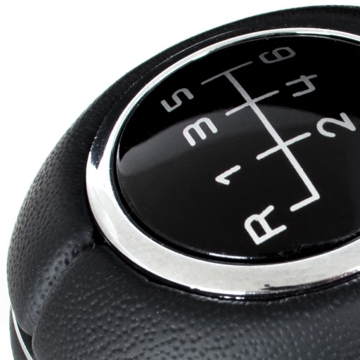 Schemat: czarna nakładka z chromowym pierścieniem i jasnoszarym schematem 6 biegów + wsteczny (R na górze)