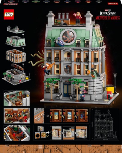 Model Sanctum Sanctorum, niesławnej rezydencji Doktora Strange’a, składa się z 2708 elementów i wiernie oddaje kultowe sceny z dwóch filmów Marvela, „Avengers: Wojna bez granic” i „Doktor Strange w multiwersum obłędu”. Na najwyższym piętrze znajduje się mistyczne muzeum, niżej biblioteka, a na parterze, zarówno w domu, jak i na zewnątrz, tradycyjne elementy znane z filmów. W zestawie znajdziesz też dziewięć minifigurek: Doktor Strange, Wong, Iron Man, Spider-Man, Ebony Maw, baron Mordo, ponury Strange, martwy Strange i Scarlet Witch, a do tego autentyczne dodatki i kilka elementów do ozdabiania. Skonstruuj ten dom, a będziesz czuć satysfakcję jeszcze długo po budowaniu.