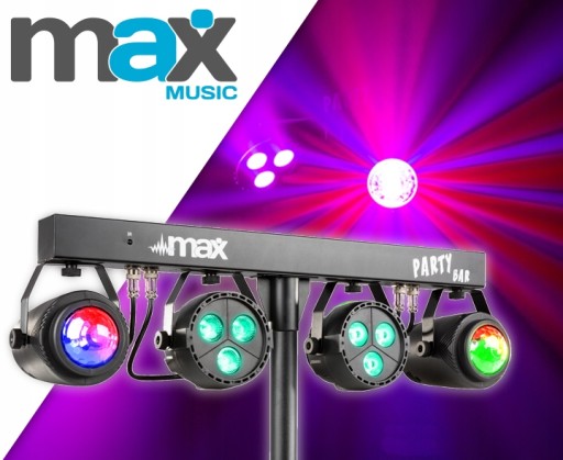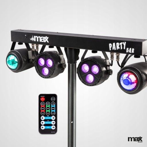 Kompletny zestaw świateł typu plug-and-play, więc gotowy do użycia natychmiast po otrzymaniu. Zestaw składa się z listwy T-bar z dołączonymi 2 punktami PAR, każdy wyposażony w trzy diody 4 w 1 o mocy 3W na diodę. Dodatkowo listwa wyposażona jest w dwa efekty świetlne Jellymoon LED z czterema diodami RGBW o mocy 3W na diodę. Dzięki tym diodom LED o dużej mocy MAX PARBAR wie, jak osiągnąć wysokie natężenie światła, a ponieważ jest bardzo łatwy w użyciu, zestaw ten może być używany do wielu (mobilnych) aplikacji. Szybka i łatwa konfiguracja i równie szybkie przechowywanie.