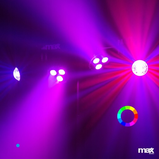Dwa spoty PAR w MAX PARBAR są wyposażone w trzy diody LED na plamkę. Te tak zwane diody LED 4 w 1 to diody RGBW/ RGBW oznacza czerwony, zielony, niebieski i biały, a mieszanie tych kolorów stwarza możliwość uzyskania wielu kolorów, w tym kolorów pastelowych. W ten sposób oba spoty dają barwną interpretację przestrzeni.
