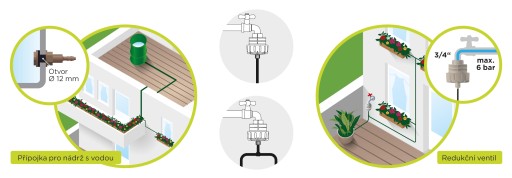 Złączka umożliwiająca podłączania węża doprowadzającego wodę do zbiornika grawitacyjnego i tym samym doprowadzenie wody do systemu nawadniania. Wyposażona w uszczelkę i plastikową nakrętkę, która pozwala zamocować ją od wewnątrz zbiornika z wodą. W ściance zbiornika należy nawiercić otwór o średnicy 12 mm i dokręcić złączkę.