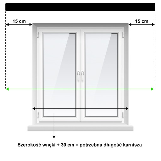 Aby prawidłowo dobrać długość karnisza, należy dokonać pomiaru według schematu zamieszczonego poniżej. Zalecamy, aby całkowita długość karnisza była o 30 cm większa niż szerokość wnęki okiennej - to znaczy, że karnisz będzie wystawał poza krawędź wnęki o 15 cm z każdej strony. Przykładowo dla wnęki okiennej o szerokości 270 cm potrzebny będzie karnisz o długości 300 cm.