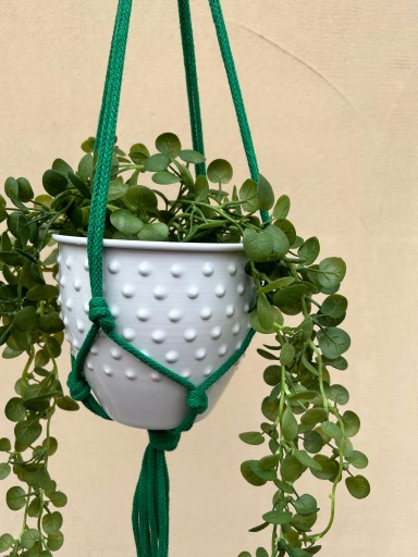 Kwietnik wiszący makrama. Wykonany ręcznie ze sznurka bawełnianego 5mm w kolorze zielonym