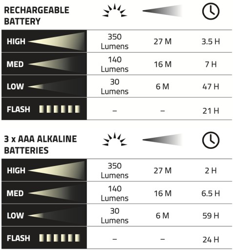 sekwencja - 350 lumenów > 140 lumenów > 30 lumenów > miganie > wyłączenie
