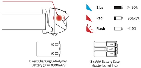 • Podwójne zasilanie - pozwala na pracę zarówno na akmulatorze lub bateriach alkalicznych 3 x AAA