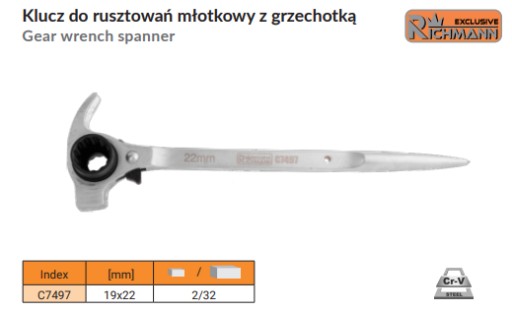 Klucz monterski do rusztowań marki Richmann Exclusive (dawniej Corona Exclusive). Narzędzie jest przystosowane do standardowych rozmiarów śrub młoteczkowych, złączy rusztowaniowych 19 i 22 mm z przełączalną grzechotką. Klucz wykonany jest metodą odkuwania, hartowany i satynowany.