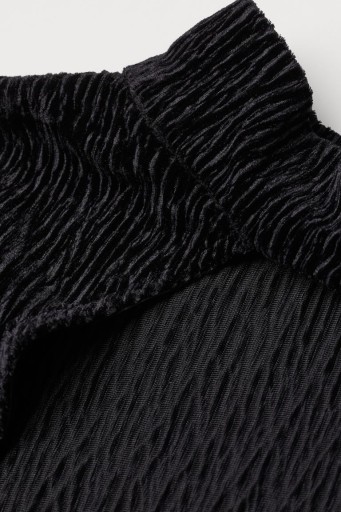 Krótki top z kreszowanego weluru. Półgolfowy kołnierz, długie rękawy, z tyłu wycięcie i guziki na karku.