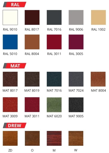 Szeroka gama kolorystyczna z palety „RAL” umożliwiająca aranżacje w dowolny i niezależny wystrój. Istnieje możliwość wyboru kolorów DREWNOPODOBNYCH.