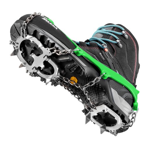 Dodatkową zaletą tego sprzętu turystycznego jest jego uniwersalna konstrukcja. Umożliwia dopasowanie rozmiaru do różnych rodzajów butów trekkingowych. Lepsze ułożenie i pewne trzymanie się raczków na stopie zapewniają tekstylne paski z rzepem. Taki typ mocowania jest łatwy w montażu i pozwala na dowolną regulację do szerokości obuwia. Dobrą przyczepność zapewniają specjalne zawiasy i wzmocnione łańcuchy. To sprawia, że mocno wbijają się w zamarzniętą ziemię. Zawiasy blokują możliwość niespodziewanego oderwania stopy od powierzchni, zapewniając lepszą stabilność podczas chodu.