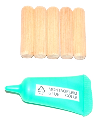 Opis: oryginalny komplet do montażu mebli z płyt drewnopodobnych lub drewna. Kołki drewniane wykonane są z twardego drewna bukowego. Klej konfekcjonowany jest w jednorazowej bardzo poręcznej tubce, dzięki czemu używanie go np.: przy sklejaniu drewna czy też montażu mebli z użyciem kołków montażowych jest bardzo proste i praktyczne.