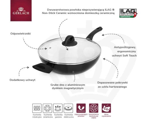 Dwuwarstwowa, nieprzywierająca powłoka ceramiczna ILAG ® Non-Stick Ceramic umożliwia gotowanie w niższych temperaturach przy użyciu małej ilości tłuszczu bez przywierania potraw do naczynia. Powłoka ceramiczna została wykonana z materiałów najwyższej jakości, które gwarantują bezpieczeństwo dla zdrowia, nawet podczas intensywnego smażenia. Produkt jest odporny na odkształcenia, wysoką temperaturę, zarysowania oraz ścieranie.