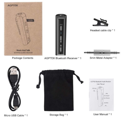 AGPTEK Odbiornik Bluetooth 4.2 z Aux 3,5 mm, CVC6.0 Mini adapter audio Bluetooth z klipsami, przenośna bezprzewodowa wtyczka BT do stereo, samochodu, głośnika, słuchawki, czarny