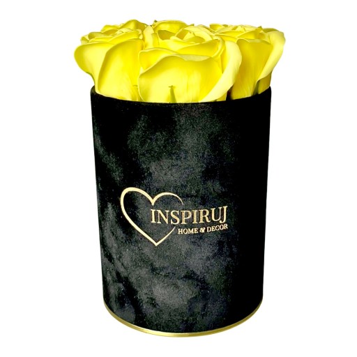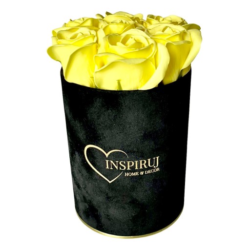 4️⃣ Kolor: Czarne pudełko z żółtymi różami mydlanymi.