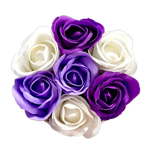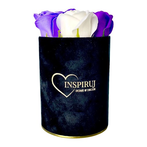4️⃣ Kolor: Czarne pudełko z mixem fioletowych róż mydlanych.