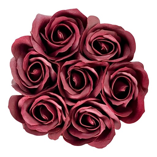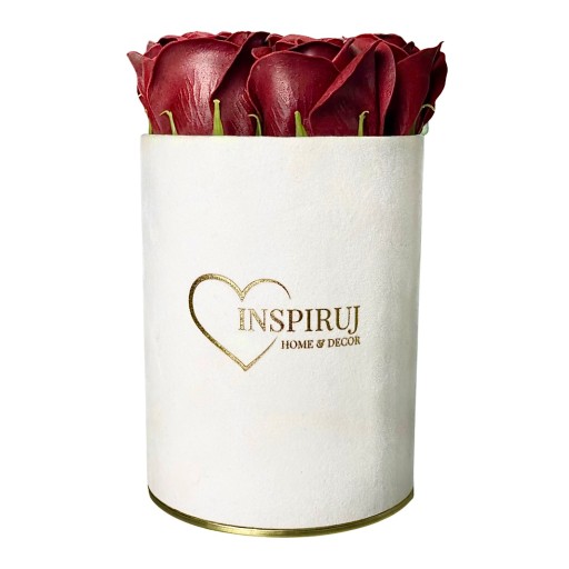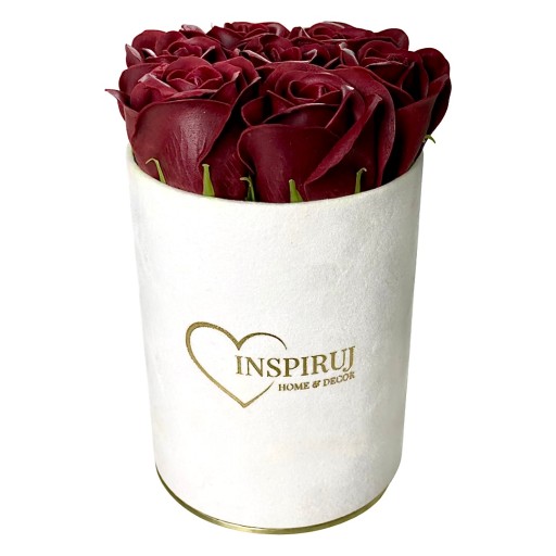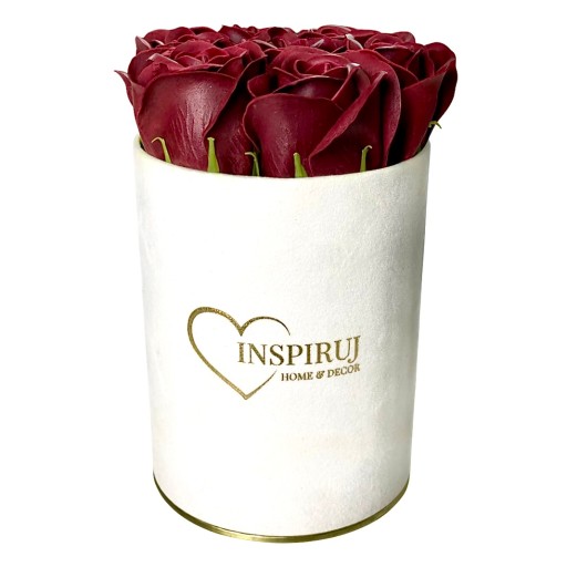 4️⃣ Kolor: Białe pudełko z bordowymi różami mydlanymi.