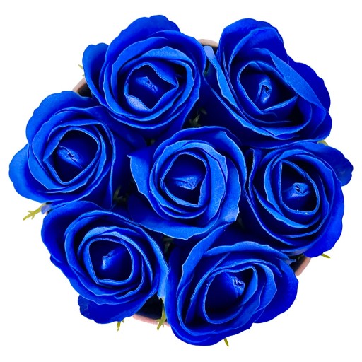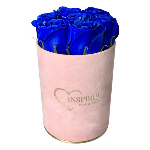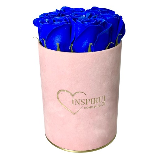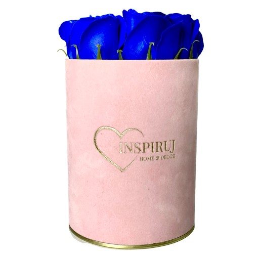 4️⃣ Kolor: Różowe pudełko z granatowymi różami mydlanymi.