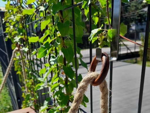 Półka posiada dwa sznurki jutowe grubości 10mm wykończone na dole supłem i niewielkim chwostem. Mocuje się ją np. do metalowych haczyków za pomocą drewnianych kółek w kolorze półki (haczyki nie wchodzą w skład zestawu).