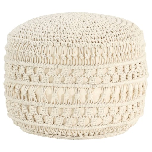 Usiądź lub połóż stopy na pufie i zrelaksuj się! Ten współczesny i elegancki podnóżek z makramy jest przyjazny dla użytkownika i sprawdzi się jako dekoracyjny dodatek do Twojego domu.