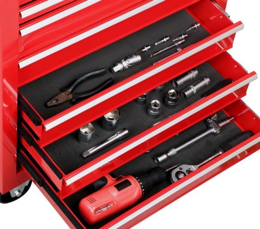Szafka narzędziowa to sprzęt potrzebny w każdym warsztacie samochodowym , garażu czy domu. Szafka posiada 5 głębokich szuflad oraz 2 płytkie szuflady wyłożone antypoślizgową matą.Produkt został wykonany z najwyższej jakości stali a krawędzie zewnętrzne jak i wewnętrzne zostały podwójnie wzmocnione.Szafka stoi na 4 mocnych kółkach 2 stałych oraz 2 skrętnych z blokadami.Produkt wysokiej jakości zapewni CI bezproblemowe użytkowanie