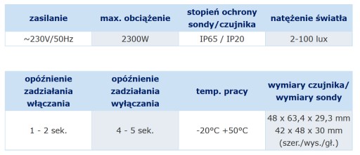 - stopień ochrony sondy/czujnika: IP65 / IP20