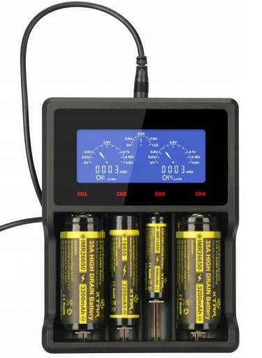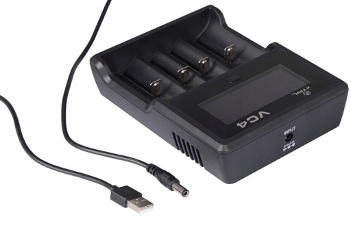 VC4 to profesjonalna procesorowa ładowarka z trzystopniowym procesem ładowania TC/CC/CV i wyświetlaczem LCD. Ładuje 1-4 ogniwa Li-ion 3,6 / 3,7V oraz Ni-MH o dowolnej pojemności w rozmiarach AAA/R03, AA/R6, 10440, 14500, 14650, 16340, 17500, 17670, 18350, 18500, 18650, 18700. W dwóch skrajnych kanałach możliwe jest ładowanie akumulatorów w rozmiarach R14, R20, 20700, 21700, 22650, 25500, 26650, 32650.