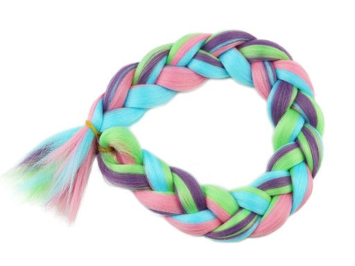 Włosy syntetyczne w przepięknym wariancie kolorystycznym - niebiesko-fioletowo-zielono-różowe. Wykonane z gładkiego i przyjemnego w dotyku henlonu.
