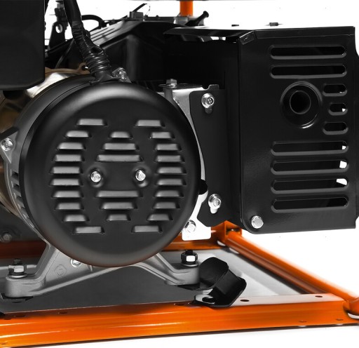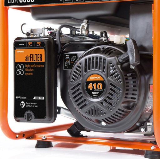Agregat prądotwórczy Daewoo GDA 6500E to urządzenie linii Master z elektrycznym rozruchem, wyposażone w niezawodny, 4-suwowy silnik benzynowy OHV o pojemności 390 cm3 i mocy 13 KM, charakteryzujący się długą żywotnością i stabilnością pracy. Jednostka napędowa spełnia normę emisji spalin Euro 5. Silnik napędza prądnice z miedzianym uzwojeniem, która generuje prąd jednofazowy o mocy znamionowej 5,0 kW i mocy maksymalnej 5,5 kW. Za stabilność napięcia odpowiada regulator AVR. Powiększony zbiornik paliwa o pojemności 30 l pozwala urządzeniu pracować nawet przez 18 godzin przy 50% obciążeniu. Maszyna wyposażona została w 1 gniazdo 16 A, 1 gniazdo 32 A oraz wyjście 12 V. Agregat posiada wielofunkcyjny wyświetlacz 3w1 (napięcie, częstotliwość prądu i czas pracy silnika), zabezpieczenie przeciążeniowe i kontrolkę niskiego poziomu oleju. Urządzenie wyposażono także w zaawansowany system filtracji powietrza zatrzymujący kurz i inne zanieczyszczenia, które mogłyby doprowadzić do przegrzania silnika. Agregat osadzony został w mocnej ramie z powiększonymi poduszkami antywibracyjnymi. Urządzenie jest przystosowane do montażu opcjonalnego zestawu transportowego.