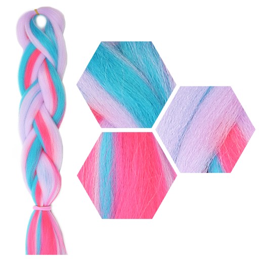 Włosy syntetyczne w przepięknym wariancie kolorystycznym - niebiesko-fioletowo-różowym. Wykonane z gładkiego i przyjemnego w dotyku henlonu.