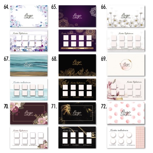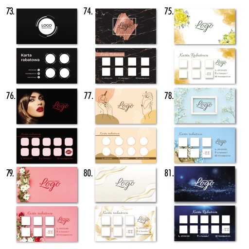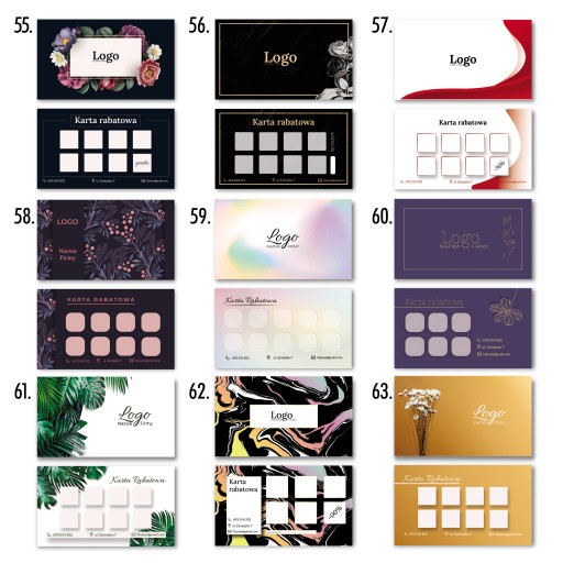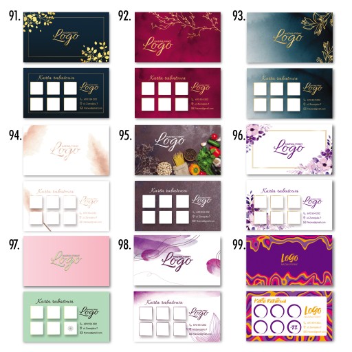 Najpierw wybierz wzór karty, następnie na pierwszej stronie zamieść swoje logo + tekst. Na drugiej stronie masz możliwość modyfikacji pól na pieczątki (ilość, kształt, kolor) oraz zmianę ikonek (telefon, kontakt, lokalizacja, strona www, social media).