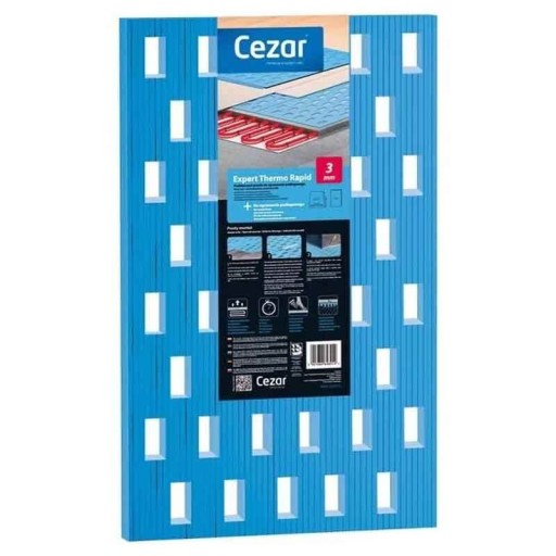 Podkład podłogowy Expert Thermo Rapid CEZAR wykonany jest z polistyrenu ekstrudowanego XPS przeznaczonego pod wszystkie typy podłóg pływających, w których zastosowano ogrzewanie, bądź chłodzenie podłogowe. Izolacja podłogowa występuje w postaci prostokątnej płyty. Jej ergonomiczny kształt pozwala na szybki system montażu oraz prostą obróbkę. W płycie występują prostokątne otwory umożliwiające idealne rozprowadzenie ciepłego lub zimnego powietrza z systemu podłogowego na całej powierzchni posadzki podłogowej. Izolacja podłogowa występuje wyłącznie w jednej grubości. Podkład podłogowy jest jedynym produktem takiego typu na rynku europejskim, co nadaje mu miano innowacyjnej izolacji podłogowej.