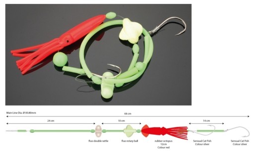 System z dwoma hakami i sztuczną kałamarnicą, został zaprojektowany przez Holgera do łowienia dużych dorszy, halibutów, molw i brosm. Posiada obrotową grzechotkę, oraz super ostre haki, które świetnie trzymają nawet okazowe ryby. Zestaw świetnie sprawdzi się przy łowieniu na głębokościach od 50 do 300m, jako przynętę polecane jest używanie całych żywych i martwych ryb.