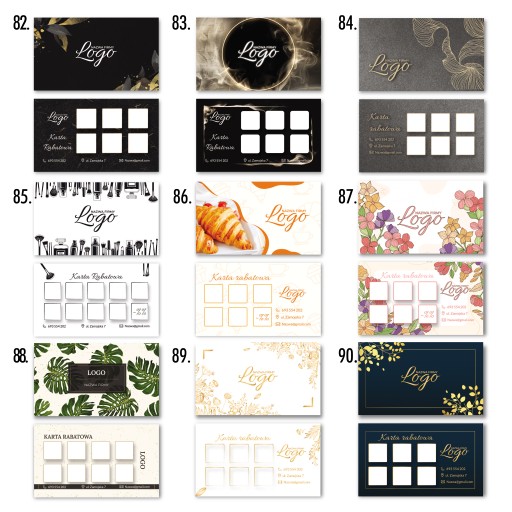 Najpierw wybierz wzór karty, następnie na pierwszej stronie zamieść swoje logo + tekst. Na drugiej stronie masz możliwość modyfikacji pól na pieczątki (ilość, kształt, kolor) oraz zmianę ikonek (telefon, kontakt, lokalizacja, strona www, social media).