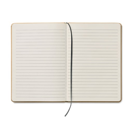 Notatnik formatu A5 z materiału z recyklingu, z dopasowaną kolorową wstążką i gumką.