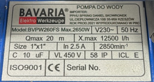 Wysokiej jakości pompa zanurzeniowa typu sito marki BAVARIA dysponująca mocą 2650W.