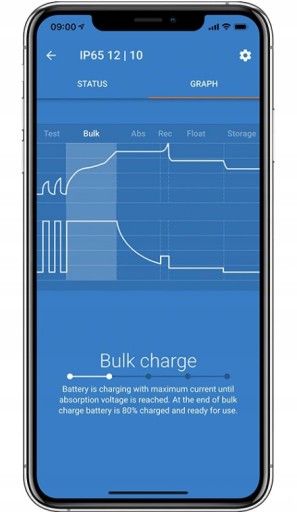 Ładowarka Blue Smart IP65 jest wyposażona we wbudowane łącze Bluetooth. Za jego pośrednictwem można sprawdzać stan akumulatora za pomocą smartfona, tabletu lub laptopa. Wszystkie ustawienia ładowarki można konfigurować w aplikacji VictronConnect.