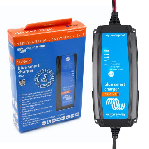 Ładowarka Victron Energy Blue Smart IP65 to nowa profesjonalna ładowarka akumulatorów z wbudowanym łączem Bluetooth. Ładowarki Blue Smart IP65 można używać do urządzeń warsztatowych oraz pojazdów silnikowych, takich jak samochody klasyczne, motocykle, samochody kempingowe, a także do łodzi.
