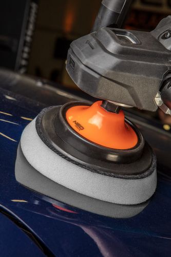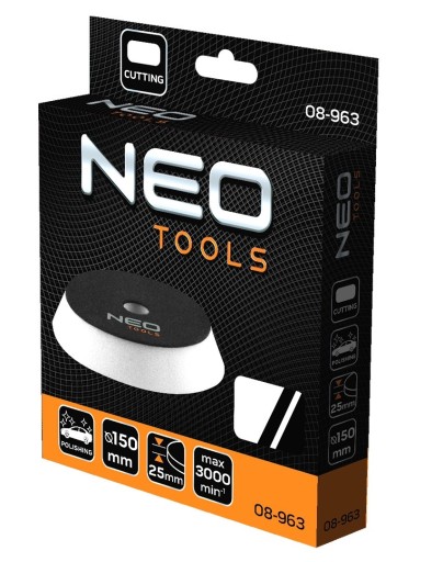 Pad polerski NEO (nr ref. 08-963) o średnicy 150 mm i grubości gąbki 25 mm, mocowany na rzep o średnicy 130 mm. Wykonany z pianki poliuretanowej. Przeznaczony do pracy z polerkami. Przeznaczony do agresywnego polerowania. Zalecany do pracy z maksymalną prędkością 3000 obrotów na minutę. Dzięki mocnemu połączeniu z uchwytem na rzep (nr ref. 08-968) produkt zyskuje większą wydajność pracy.