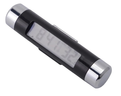 Zegarek i termometr samochodowy z podświetlanym wyświetlaczem w kolorze niebieskim wraz uchwytem.