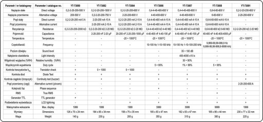 Multimetr (miernik elektryczny) YT-73080 możemy zmierzyć podstawowe wartości istotne w eksploatacji urządzeń elektrycznych. Multimetr pozwala nam na zmierzenie napięcia stałego lub przemiennego, prądu stałego i rezystancji. Pozwala nam także skontrolować diody i tranzystory. Miernik uniwersalny YT-73080 jest podstawowym modelem w naszej ofercie multimetrów.
