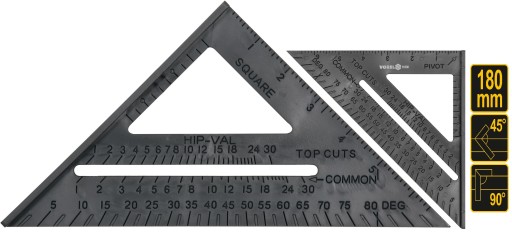 Kątownik ciesielski 180 mm ze stopką.wykonany z odpornego na uszkodzenia mechaniczne tworzywa sztucznego. Na krawędziach i na powierzchni naniesiona trwale podziałka calowa i milimetrowa. Kątownik przeznaczony do prac dekarskich i innych związanych z trasowaniem.
