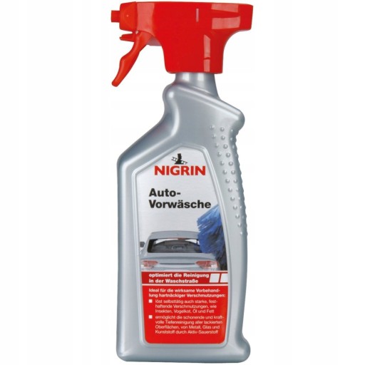 - NIGRIN Car Pre-wash umożliwia szczególnie efektywne czyszczenie Twojego pojazdu w myjni samochodowej i jest łatwy w użyciu. Z pomocą aktywnego tlenu, NIGRIN wnika głęboko w brud i usuwa cząsteczki brudu silnie i automatycznie.