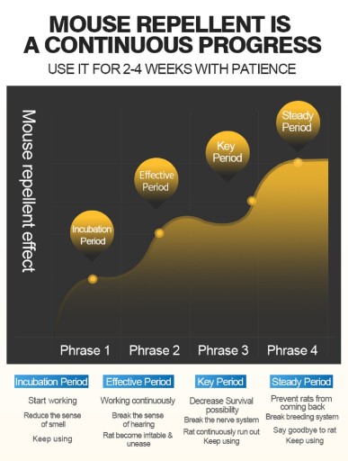 1. W pierwszym okresie użytkowania urządzenia może wzrosnąć aktywność gryzoni, wynika to z faktu ich migracji, po podrażnieniu ich układu nerwowego ultradźwiękami. Po prostu będą uciekać z wrogiego dla siebie terenu.