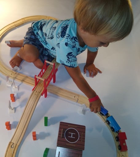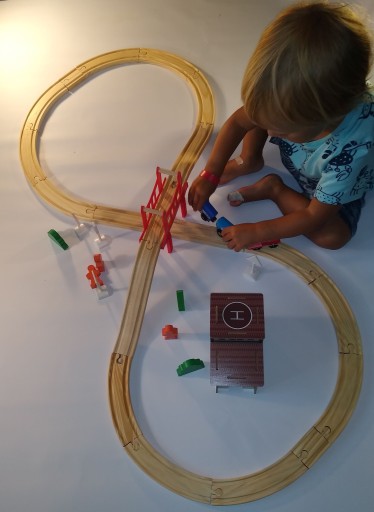 Unikalny zestaw drewnianych torów oraz pociągu, który tworzą zabawny tor, a wiadukt zwiększa atrakcyjność zestawu.
